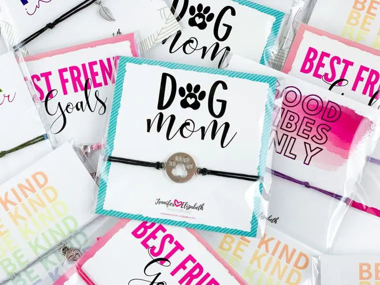 These inspirational sliding knot bracelets are our best sellers! They make the perfect gifts and they stack together nicely with other bracelets. This listing is for the "Dog Mom" quote card with an adjustable sliding knot bracelet. The bracelet is made out of black waxed cotton cord and includes a paw print charm. The bracelet is attached to the card and placed inside of a plastic sleeve.