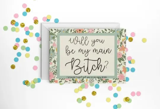 The "Will you be my main B*?" wedding card is a fun and cheeky way to ask your bridesmaids and matron of honor to stand by your side on your big day. Featuring playful text and a modern design, this card adds a touch of humor and excitement to the bridal party invitation process. It's perfect for those who want to show their appreciation for their closest friends in a unique and memorable way. Whether you're looking for a lighthearted touch or something a little sassy, this card is sure to make your bridesmaids and matron of honor smile. Ideal for a personalized, heartfelt message that reflects your bond and sense of humor.
